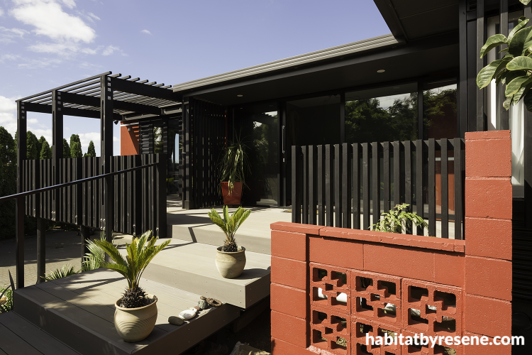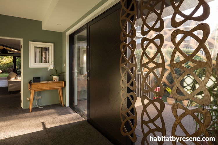 The new entry is much better defined with a smart new front door, a decorative laser cut window hanging and walls in Resene Finch.