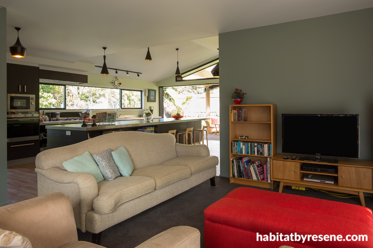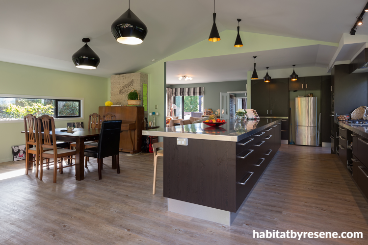 The two greens (Resene Finch in the background and Resene Rice Paper in the kitchen) provide a visual link to the outdoors.