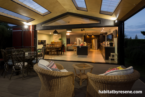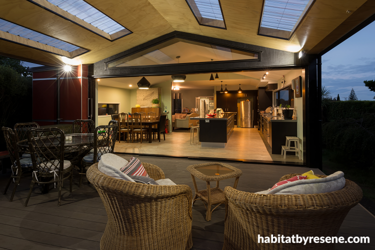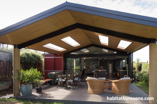 A superb covered outdoor living space now opens wide from the kitchen and dining area. The cladding is in Resene Red Pepper and the kitchen area is in Resene Rice Paper.