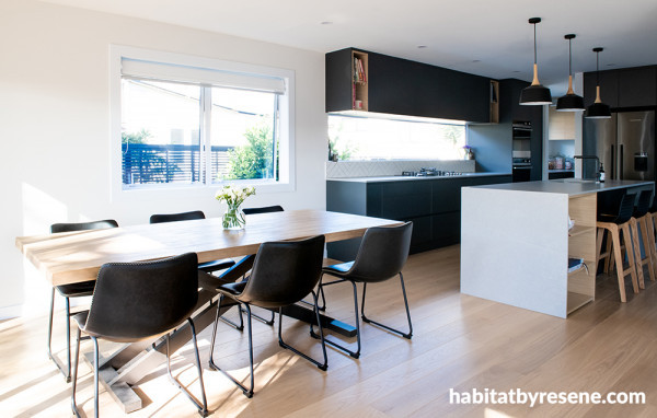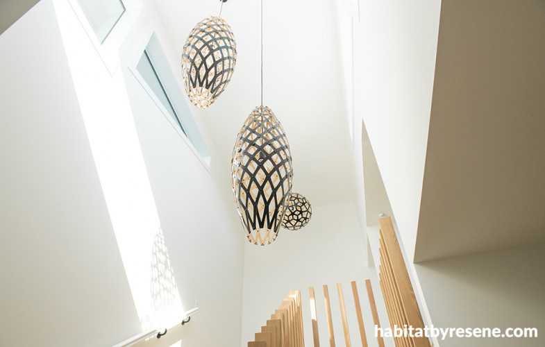 David Trubridge lights and custom-made oak slats are featured in the central stairwell which is the first thing you see when you open the front door. These features are highlighted by the use of crisp Resene Black White on the walls.