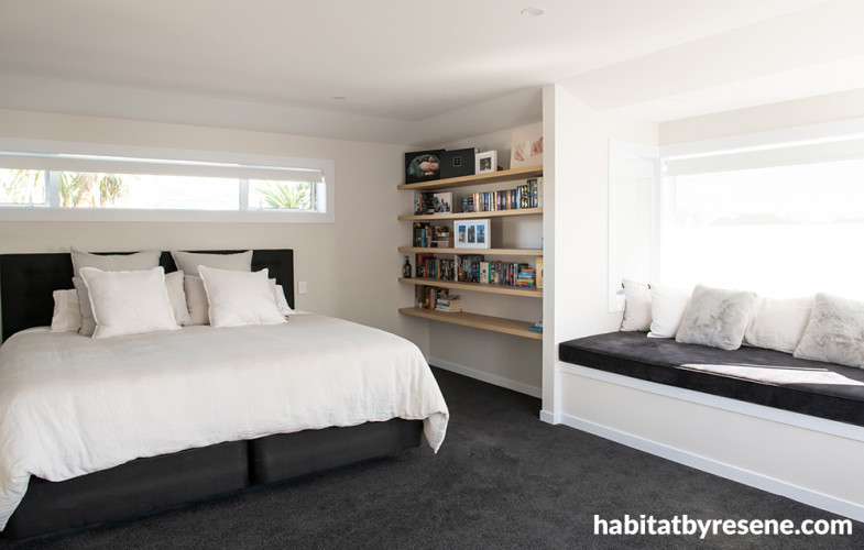Louise and Eugene specifically designed the kitchen with storage in mind and the butler’s pantry is perfect to hide away any clutter (and the craft beer fridge too!). The bookshelves on the front of the island, and on either end of the overhead cabinets, add a nice yet practical feature. The kitchen has a monochrome colour scheme with Resene Black White on the walls. For as similar black colour to the cabinetry, try Resene Nero.