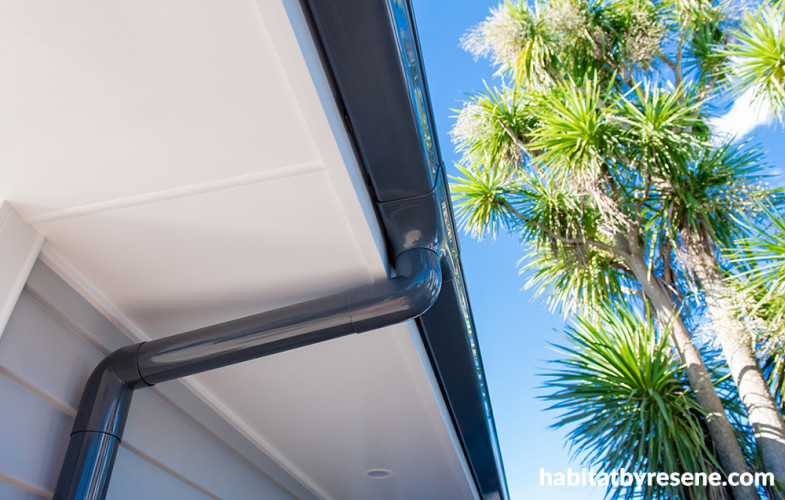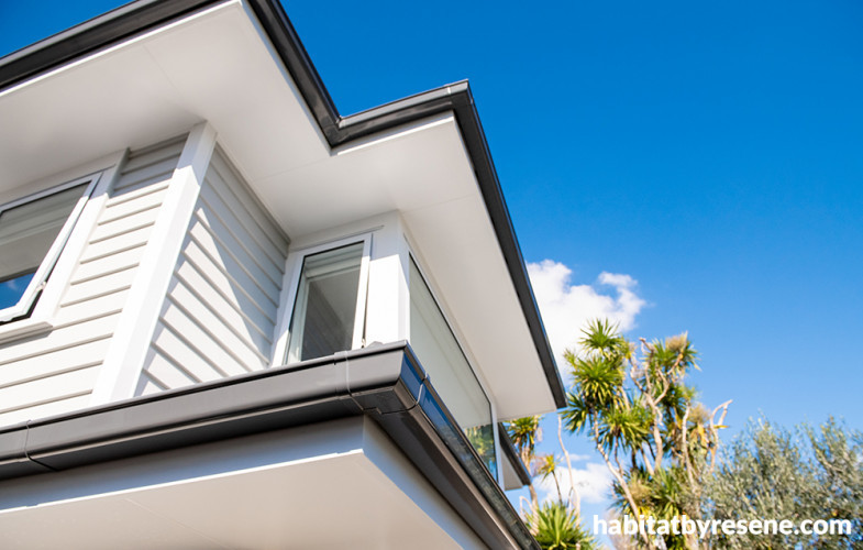 The Stormcloud® quarter-round profile has clean, strong lines which fit in with the modern yet classic styling. Marley Stratus Design Series® has a 15-year guarantee and excellent UV resistance. It is a striking contrast against the Resene Silver Chalice weatherboards.