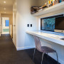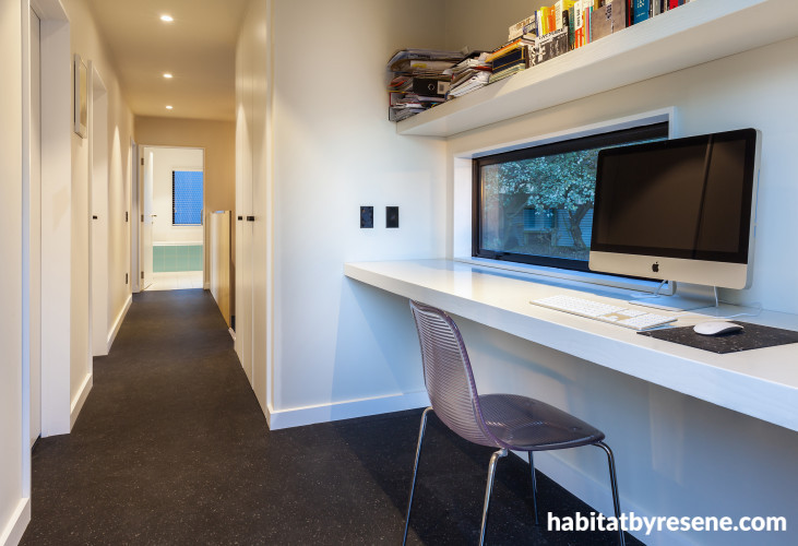 A study nook is neatly integrated into the hallway. The walls are in Resene Half Sea Fog.