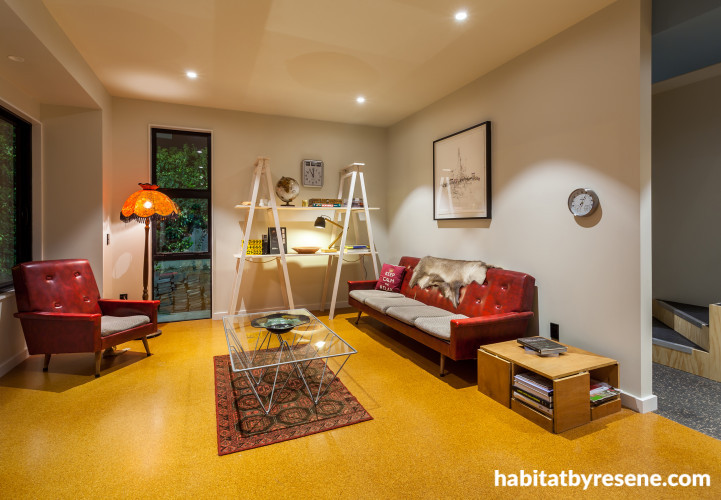 Retro furniture and a warm cork floor are complemented in walls painted in Resene Half Sea Fog for the living room.