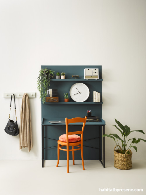 This painted office wall feature and matching shelves and desk are painted in the deep slate blue, Resene Fast Forward. The walls are in Resene Sea Fog, the floor is in Resene Truffle and the hooks are in Resene Secrets. The bright orange chair is painted in Resene Jailbreak and the hooks in Resene Secrets. The desk organiser is painted in Resene Alabaster with drawers in Resene Truffle and Resene Earthen. The small plant pots are in Resene Moccasin and Resene Soulful. Project by Annick Larkin, image by Melanie Jenkins.