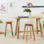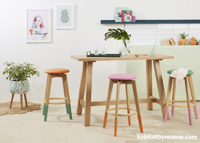 The stools of this playful kitchen and dining area are painted in Resene Away We Go, Resene XOXO and Resene Party Zone. The kitchen cabinet is painted in Resene Aura, the walls are in Resene Rice Cake and the ply floor is finished in Resene Aquaclear. The shelf is in Resene Atlas, the pot plant is in Resene Rice Cake with Resene Away We Go. The vases are in Resene Away We Go, Resene XOXO and Resene Party Zone. Project by Kate Alexander, image by Bryce Carleton.