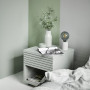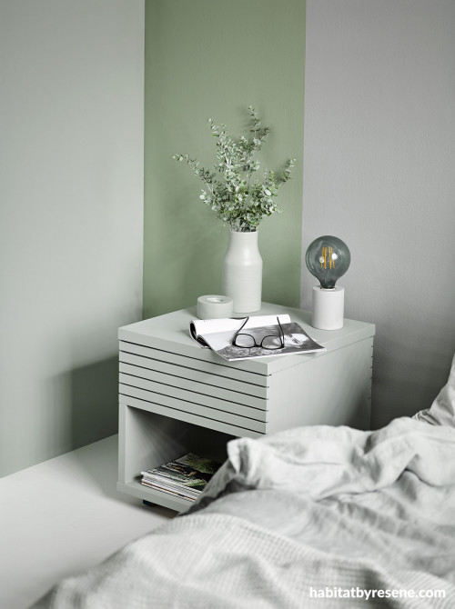 Painting walls and furniture are two minor changes you can make to rental properties. When painting walls seek written permission from a landlord. The green wall block is painted in Resene Peace and the adjacent walls are Resene Helix (left) and Resene Silver Chalice (right). The bedside table and vase are painted in Resene Helix. The lamp is in Resene Silver Chalice and the round tea light holder is in Resene Peace.