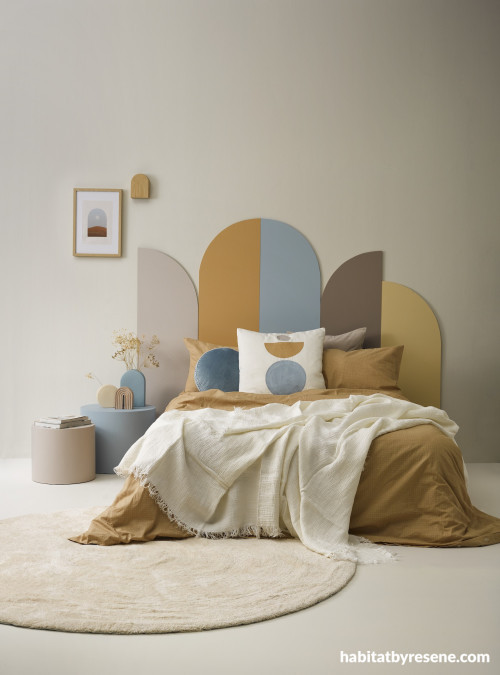 By making your own MDF headboard, you can easily change the colours of a room with the seasons. The deco-style curves of these headboard panels echo the lines of the bed. The circular forms add to the comforting feel of the room.