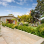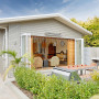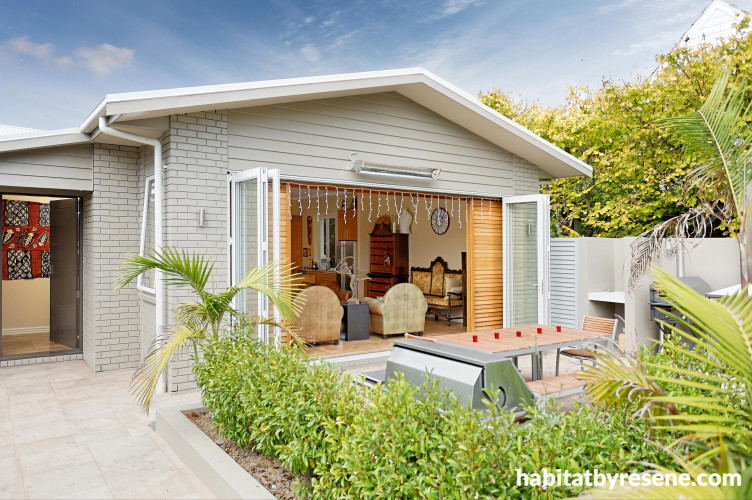 Bifold doors create indoor-outdoor flow from the living area to the patio and garden. The exterior of the house has been painted with Resene Double Napa, except for the soffits, which are painted with Resene Quarter Napa.