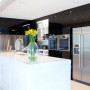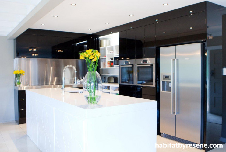 A striking contrasting scheme uses Resene Nero and Resene Sea Fog in this kitchen by Rochelle Jackson of Kitchen Elements.