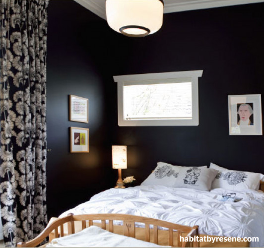 Black is great for night-time rooms, like this bedroom designed by LeeAnn Yare which uses Resene Black for the walls and Resene Bianca for the trims.
