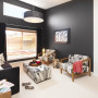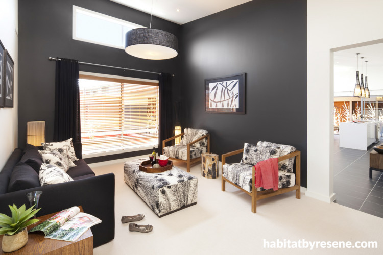 Resene Nero is a stunning wall colour for this sophisticated living room, which is part of a Simonds showhome designed by Suzie Fraser in Australia.