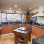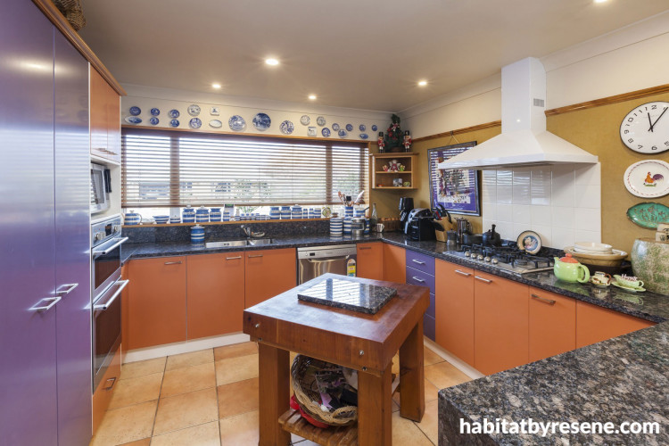 Looking beyond the kitchen’s classic layout, Caroline created a contemporary space using bright Resene Tuscany and deep purple Resene Chapta And Verse on the cabinetry with Resene Quarter Spanish White on the trim.