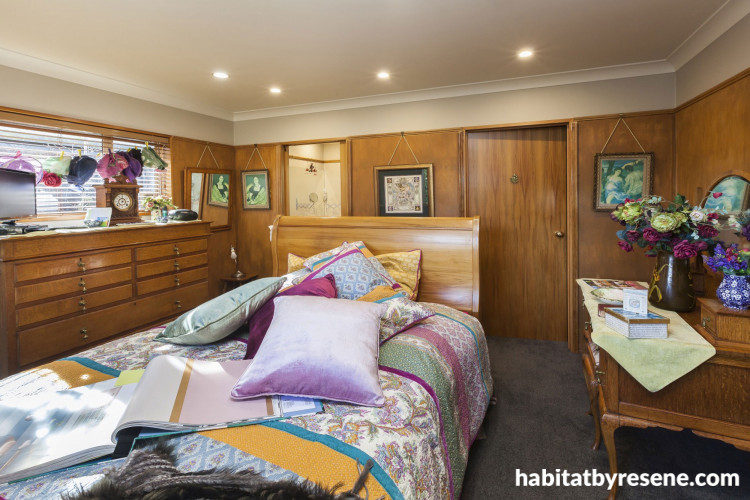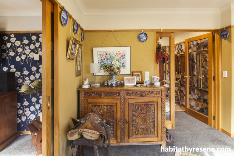 In the living area, Caroline created a feature wall with the Poppies design from the Mason handcrafted wallpaper collection available from Resene ColorShops. The hand-painted wallpaper has a base of Resene Indian Ink and Resene White with accents of metallic Resene Bedrock and Resene Gold Dust. The feature wall provides the perfect backdrop for Caroline’s eclectic décor and colourful treasures including her green leather couch and collection of antique wooden furniture.