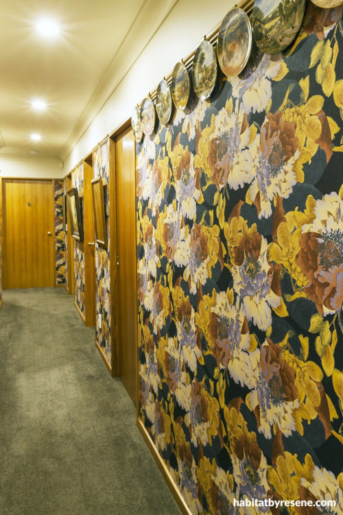 “The wallpaper just jumped out at me when I walked past the Resene shop window,” says Caroline. “It is a really autumnal, vibrantly patterned wallpaper and when I saw it, I just thought ‘wow’.