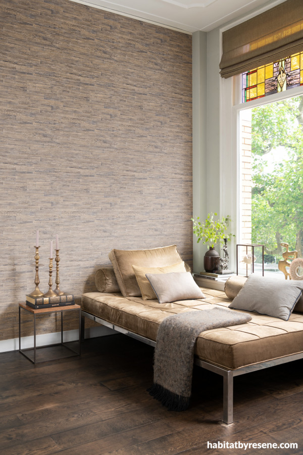 The earthy tones and schist look of Resene Wallpaper Collection 537031 suits a number of home aesthetics, including modern industrial, rustic and contemporary. It all depends on your décor and the colours you’re choosing to pair it with. In this room, the choice of luxurious fabrics and classy décor make it a sophisticated space. To bring out the beauty of this wallpaper, pair it with classic neutrals like Resene Rice Cake, Resene Half Blanc or Resene Quarter Biscotti.