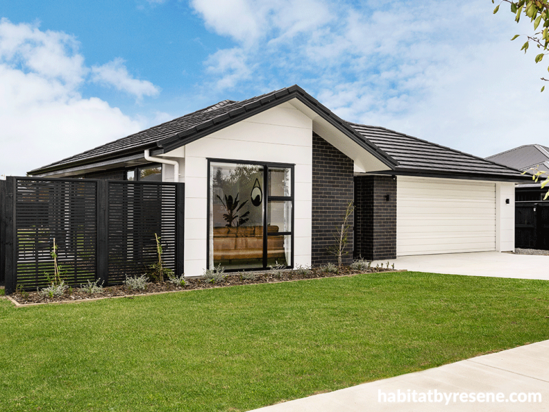 The exterior colour palette was chosen to blend in with the modern new subdivision of Rose Manor, using Resene Triple Black White for the stria cladding and soffit, Black Espresso bricks from The Brickery and Resene Black for the guttering and fascia.