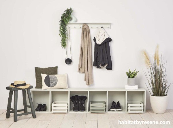 Layer earthy mid-toned neutrals with soft and diffuse whites for a comforting, welcoming feel, that works particularly well in areas like entrance ways and gathering points like kitchens and sitting rooms. Here the walls are Resene Eighth Bison Hide, with floors washed in Colorwood Breathe Easy, hook shelf in Tana, cubby bench seat in Quarter Tana, crates in Linen, Triple Rice Cake and Rice Cake, stool in Triple Lemon Grass, vase in Duck Egg Blue, planter in Eighth Tana. Scarf from Maman. Project Annick Larkin. Image Bryce Carleton