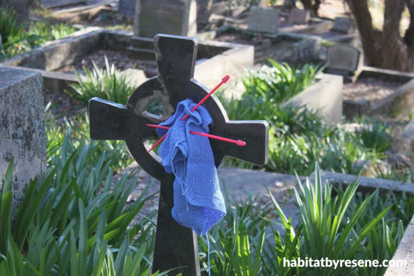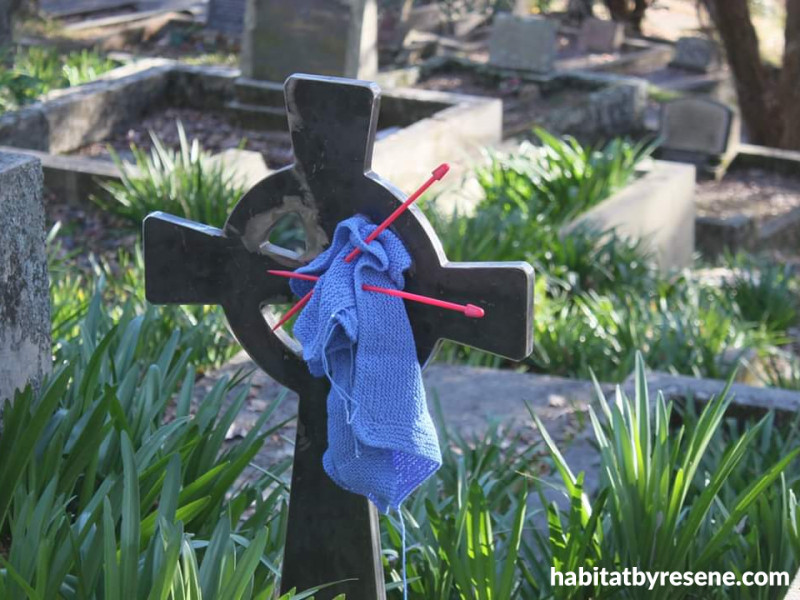 Ollie’s new metal gravestone was donated by local ship maintenance firm Kernohan Engineering. The volunteers decorated the cross with some knitting.