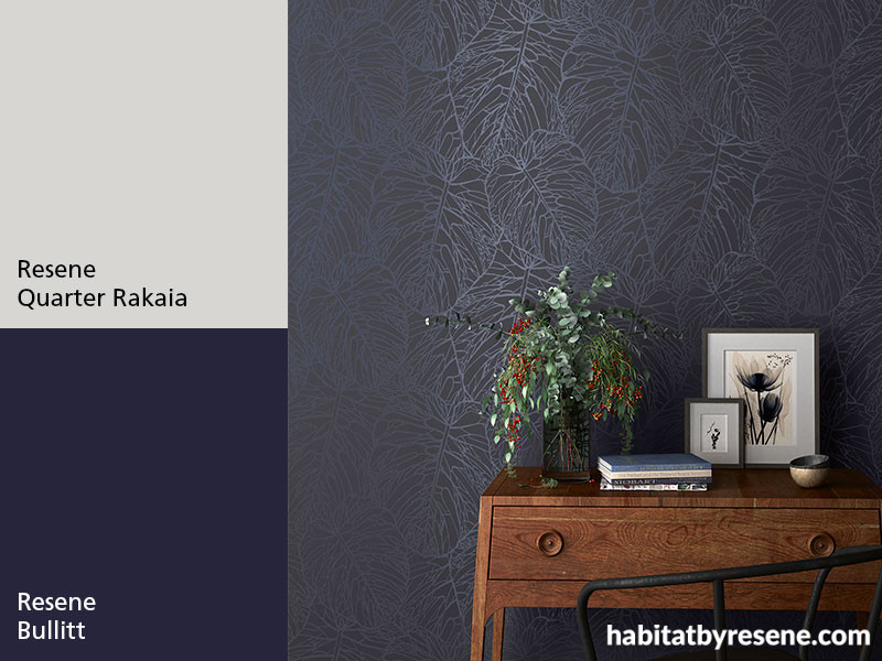 Complement the wallpaper with paint colours such as Resene Bullitt, a luxe purple/black combo, Resene Waterloo, a mysterious mix of grey and mauve, and Resene Quarter Rakaia, a pale grey with a hint of warmth.