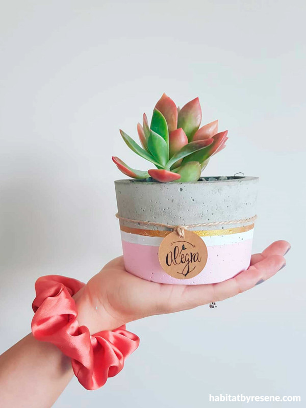 These handmade concrete designs will give your mother something to smile about. Nataly from Alegra has always loved creating. After becoming a mum herself, she started Alegra and began producing colourful plant pots and candles to colour people’s homes. “Alegra is made with love,” says Nataly. “Every piece is different and comes with a splash of cuteness for all the beautiful mommas out there.” This cute concrete plant pot was painted in Resene Princess with a touch of Resene White and Resene Gold. You can order from Alegra here.
