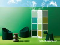 Wall in Resene Aloe Vera, floor in Resene Wild Side, screen in (left panel, from top) Resene Transcend, Resene Green Acres, Resene Boundless and Resene Rolling Hills, (middle panel, from top) Resene Wabi Sabi, Resene Smashed Avocado, Resene Good To Go and Resene Tarzan, (right panel, from top) Resene Eau De Nil, Resene Green Days, Resene Field Day and Resene Staycation. Bay armchair by Raffaella Mangiarotti and Doggy sculpture by Eero Aarnio, both for Serralunga from ECC, Teti side table by Prospero Rasulo for Zanotta from Studio Italia.