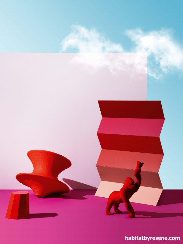 Wall painted in Resene Petal, floor in Resene Temptation, screen in (top to bottom) Resene Aroha, Resene Very Berry, Resene Rudolph, Resene Arriba, Resene Soiree and Resene Awaken. Arnold Circus stool in Red by Martino Gamper (small) from Everyday Needs, Spun chair in Red by Thomas Heatherwick for Magis from ECC, Kong XS velvet lamp in Red by Qeeboo from Smith & Caughey’s.