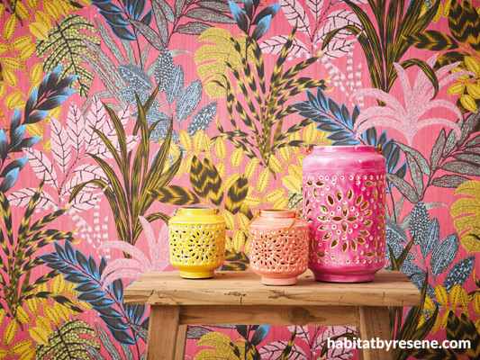 A brighter and more vivid version, Resene Wallpaper Collection 37860-2 has the fun and entertaining shades of pinks, yellows and blues, leaving you free to add pops of colour throughout your exotic themed room.