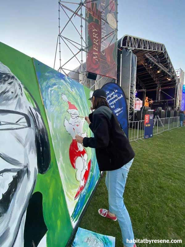 Four murals in four hours. That was the challenge for Hawke's Bay artist Michelle Jung at the recent Christmas in the Park in Hastings. During the event, held at Mitre 10 park in Mitre 10 Sports Park, Michelle had the challenge of painting four colourful caricatures using Resene paint, before sunset.