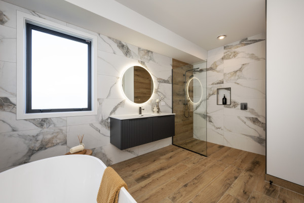 The bathroom is a stylish retreat with walls and ceiling painted in Resene Wan White, complementing the timber flooring and tiles.