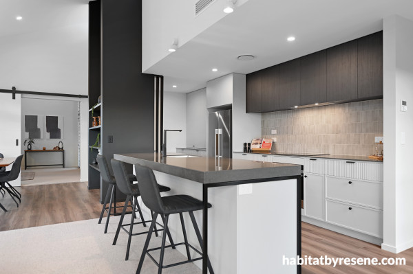 The wood, steel and dark shades in the kitchen create a chic, modern-industrial feel and work to separate the kitchen from the rest of the open-plan space. Use Resene Colorwood Natural on wood for a natural look to show the beauty of the grain. For a darker shade on your kitchen cabinetry and island, use Resene Colorwood Pitch Black.