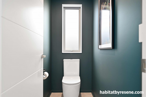 The dark features continue through this home into the WC where a deep, masculine green, Resene Warrior, is used on the walls. This dark colour helps make the most of this small space. As a complementary shade, Resene Merino is used on trims and doors.