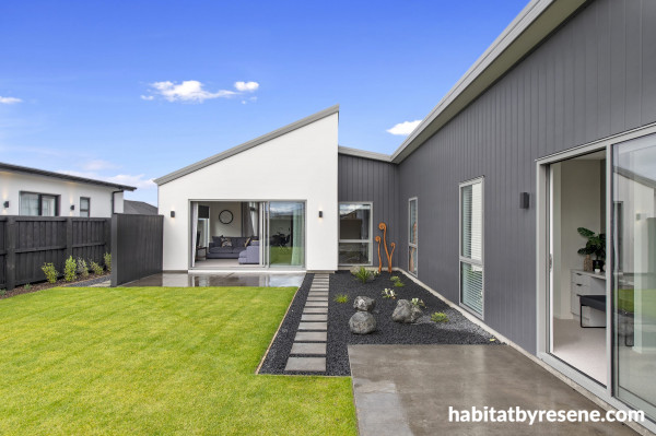 The angles of this home exterior are striking, and what gives this home even more street appeal is the choice of colour. The white Rockcote wall, in Resene Quarter Foggy Grey, accentuates the angles and brings them into focus, while the darker shade of Resene Fuscous Grey creates a stunning contrast. This home proves that you don’t have to paint your exterior in one colour to get a cohesive look. The whites and greys seamlessly blend from the outside in.