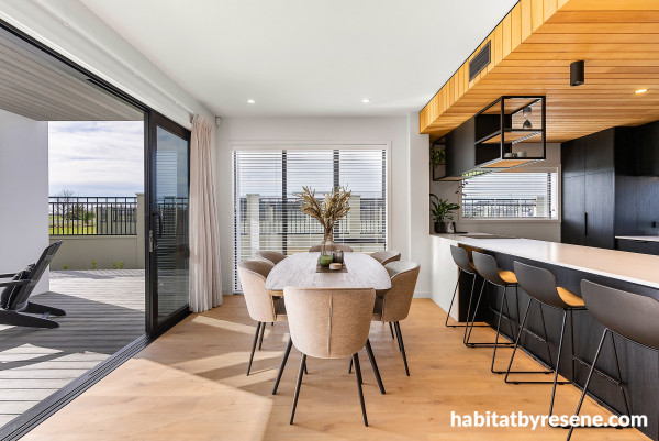 In the kitchen and dining area, Resene Quarter Iron is used again on the walls, ceiling and trims. This cool shade is made warmer here as the wooden features and floor reflect the sunlight around the space, and the inviting table and chairs make this space a comfortable and welcoming place to entertain.
