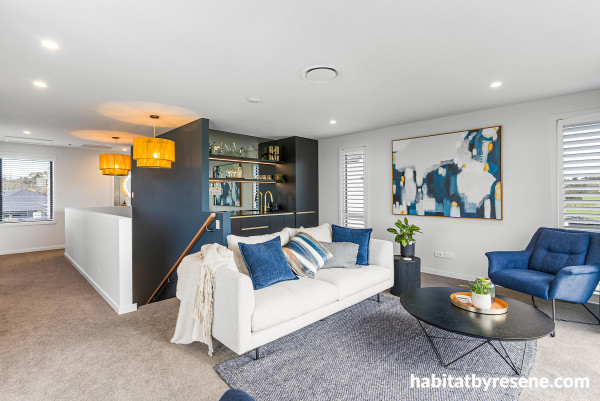 The blue shades continue through this home into the upstairs living room through artwork and accented décor and furniture. The side of the staircase leading downstairs is painted in a dark seaside blue, Resene Coast, an elegant and versatile shade for all seasons. The walls, ceiling and trims are painted in the cool and timeless Resene Quarter Iron.
