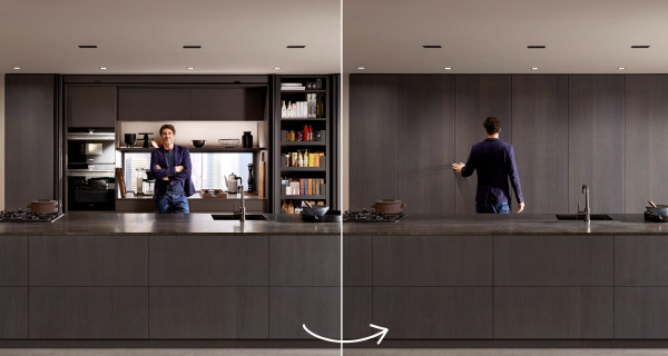 When open, everything you need is right at hand. With a gentle press, the doors glide smoothly into their discreet pockets, keeping the space feeling open and easy to use. When you’re done, simply close the doors and the entire area disappears leaving behind a clean, calm considered surface.