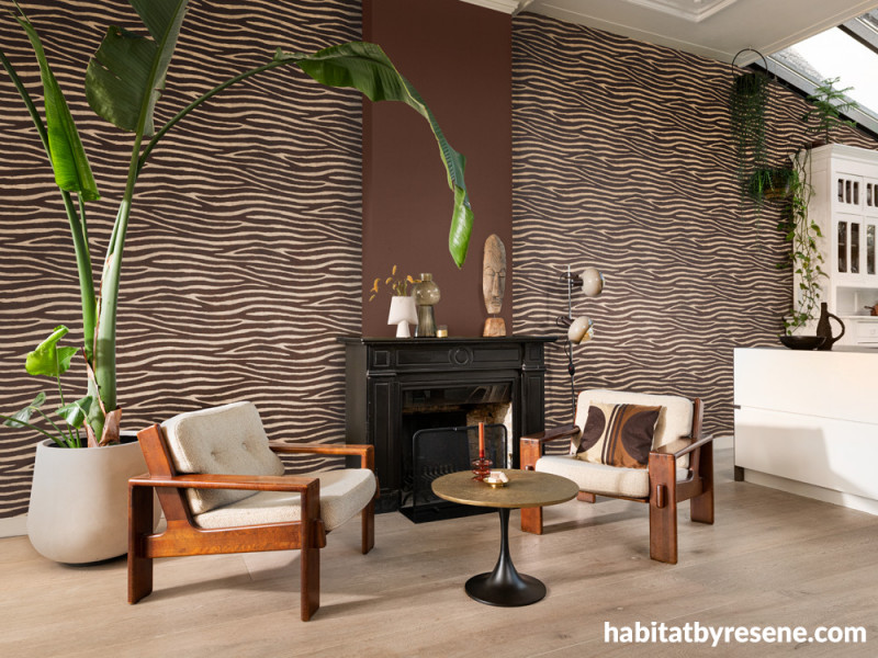 Get your guests talking with the animal print pattern in Resene Wallpaper Collection 752663. This design suits both contemporary and traditional homes. Using earthy tones and natural elements, you can create a unique space with an African twist. Pair this with chocolate browns like Resene Brown Bramble or creamy whites like Resene Merino and Resene Half Rice Cake.