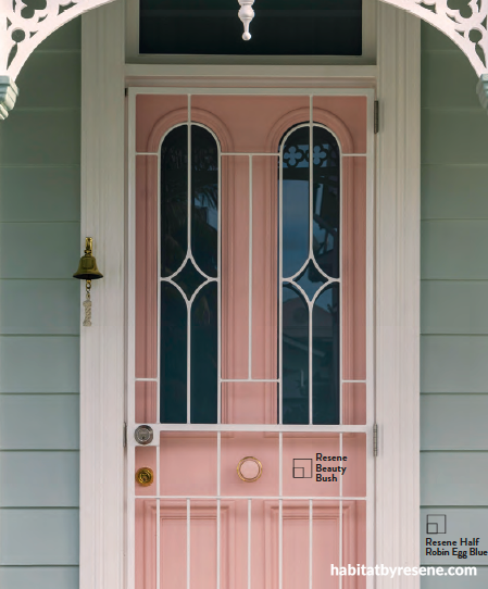 Robyn, the first winner of the Making an Entrance 2024 competition with Resene, says she's lost count of how many people have stopped during a stroll down her street in Auckland's Devonport to say how much they love her front door. Robyn, who has a Master of Fine Arts, says she has always been entranced by colour, and it took six tries before she settled on Resene Beauty Bush for the door of the late-1880s cottage she shares with her husband Dave. The colour pairs beautifully with weatherboards in Resene Half Robin Egg Blue. Image by Ricky Wilson.