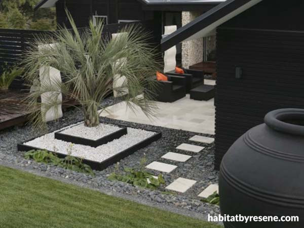 This garden designed by Sandra Batley of Flourish Gardens complements a house finished in Resene Waterborne Woodsman CoolColour tinted to Hackett Black. The landscaping of hard surfaces in cream and white is showcased by the depth of the dark walls, and nature’s green softens the whole palette.
