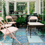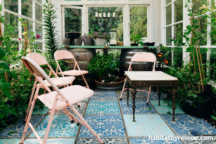Mason Peacocks MP02 wallpaper finished in Resene Pure Pewter from the Mason Handcrafted Wallpaper collection available from Resene ColorShops, adds an elegant touch in the bathroom. The peacock pattern also reappears on the concrete pavers in the homemade conservatory. Ben used various shades of blue, including Resene Resolution Blue, Resene Bunting, Resene Orient and Resene Kumutoto to create a stylish finish on the pavers. “We put the concrete blocks on our table and screen printed the peacocks directly onto them,” says Ben. “We used Resene SpaceCote Flat, which has worn remarkably well.”