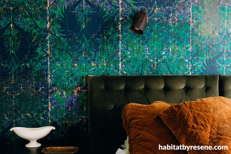 The connecting corridor from the living area to the rest of the home uses a wallpaper from the popular Mason Collection; Mason Mayfair MM02, that features a customised colour palette of Resene Rangoon Green, Resene Lucky Break, Resene Double Stack and Resene Half Nocturnal. “It’s very easy to customise the wallpaper to suit the colour palette you’re working with,” says Ben, who uses Resene paint to screen print the Mason Collection wallpapers.