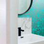 The bathroom features the fun yet elegant Mason Peacocks MP02 from the Mason Handcrafted Wallpaper collectionwith a custom base and silvery Resene Pure Pewter. For a similar bold aqua look, try Resene Niagara.