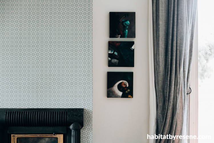 Ben is also a fine artist and his paintings shine on the Resene White Pointer wall in the living area. The handmade wallpaper is Mason Cydon MC02 from the Mason Handcrafted Wallpaper collection coloured in Resene Half Taupe Grey and Resene Double Stack.