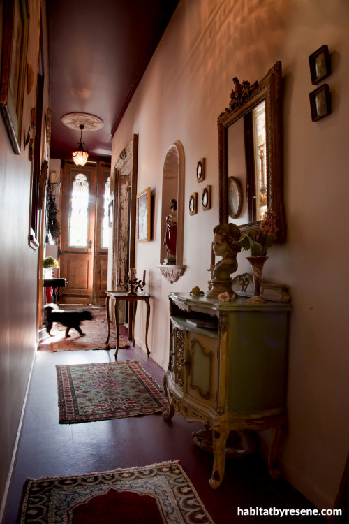 Claire loves the Parisian chateau look as well as a few other European styles such as Rococo and Venetian. It’s an eclectic mix that makes her heart sing. Her European-inspired colour scheme continues into the hallway with Resene Arthouse on the ceiling and the walls with a custom pale pink, created for her especially by the Resene ColorShop. For a similar, slightly paler pink, try Resene Just Right.