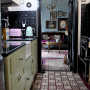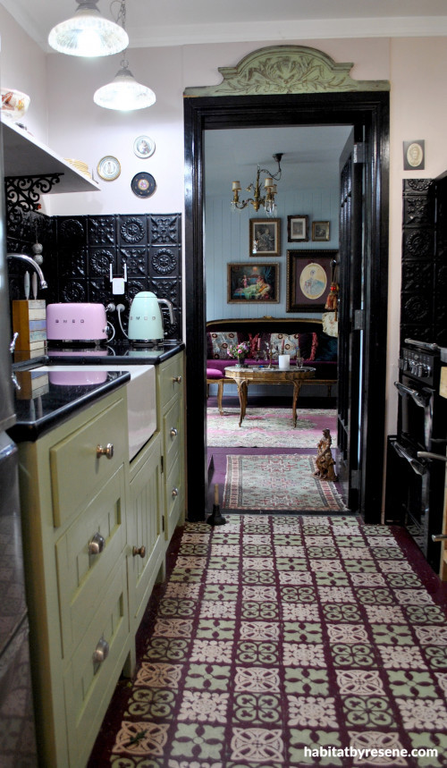 The kitchen floor is painted in Resene Arthouse with a stencil of Resene Pale Leaf and Claire’s custom pink. The cabinets are Resene Pale Leaf and the custom pink, try Resene Just Right for a similar shade.
