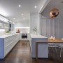 Kitchen designer Leonie Hamill created an elegant open plan space in this kitchen with Resene Half Black White on the walls, ceiling and trim. Image by Kallan MacLeod.