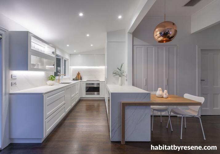 If you have a traditional villa or an older home, creating an open plan layout is an excellent way to create the illusion of space while still keeping things practical. This kitchen and dining space was created by kitchen designer Leonie Hamill, who used Resene Half Black White on the walls, ceiling and trim to create a greater sense of space. Leonie worked in harmony with the traditional villa elements of the home and ‘cheated’ the space by creating a lowered timber benchtop to replace the need for a dining table. “My advice is to work within the space and combine the kitchen and dining together,” says Leonie. “Look into your house floor plan and see if there is another room which you can combine into your kitchen and dining space.