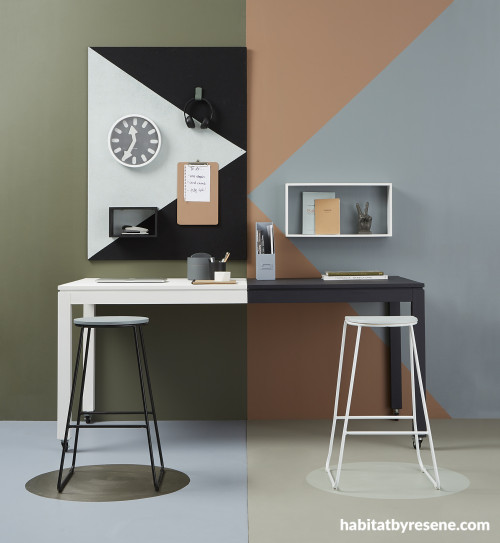 This creative use of space uses colour to define this office space. The left wall is in Resene Raptor with triangle in Resene Rolling Stone. The left side of the floor is in Resene Neutral Bay with circle in Resene Blast Grey 3. The right wall is in Resene Leather with triangle in Resene Emerge. The right side of the floor is in Resene Castle Rock with circle in Resene Half Washed Green. The left-hand side of the table is in Resene Alabaster, while the right is in Resene Jaguar. Project by Greer Clayton. Image by Bryce Carleton.