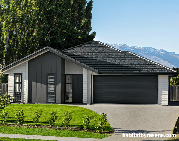 For the vertical Stria boards, I chose Resene Baltic Sea – a dark yet warm charcoal which matched the dark grey roof and garage door and charcoal window joinery beautifully.