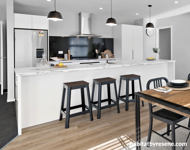 The kitchen walls and kitchen island are painted in Resene Half Ash with Resene Half Alabaster on the ceiling and trims.